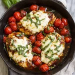 A cozy Chicken Caprese Skillet featuring fresh tomatoes, creamy mozzarella, and zesty pesto—all prepared in one pan for a quick and delicious meal.
